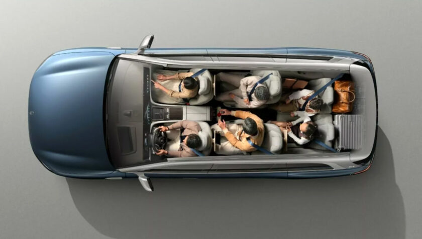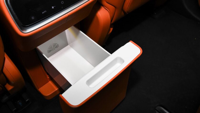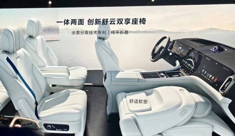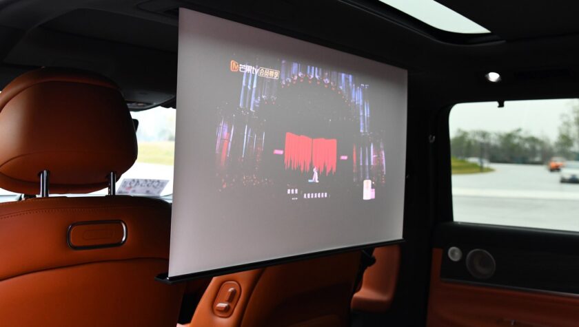 В шестиместном салоне Aito M9 (посадочная формула 2+2+2) установлено четыре планшета (для пассажиров второго и третьего ряда), а также сразу за передними креслами сверху можно развернуть 32-дюймовый экран, на котором с помощью проектора (установленного сзади) тоже можно вывести “картинку”. На передней панели три дисплея под единой стеклянной поверхностью: виртуальная приборная панель, центральный экран медиасистемы и дополнительный дисплей для пассажира.