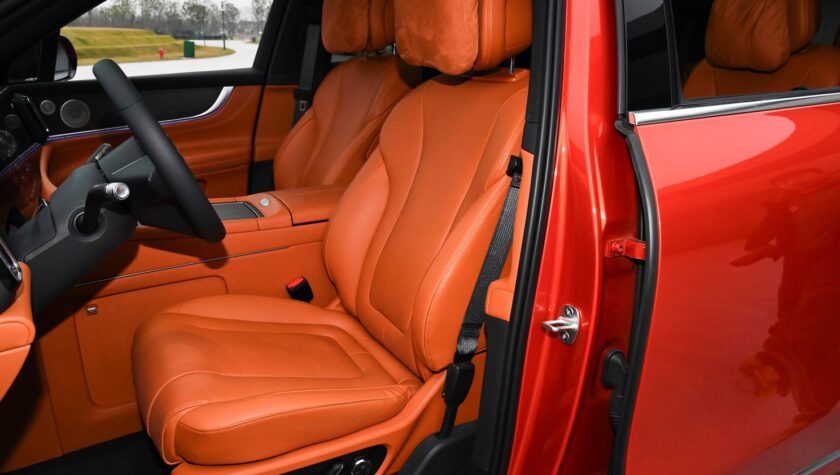 В отделки салона используется дорогие материалы: кожа Наппа и натуральное дерево. Кресла первого и второго ряда оснащены электрорегулировками (со множеством настроек), вентиляцией, подогревом и 8-точечным массажем. К слову, кресла имеют множество конфигураций и положений, например, можно сделать “ровный пол” для спального места на двоих.