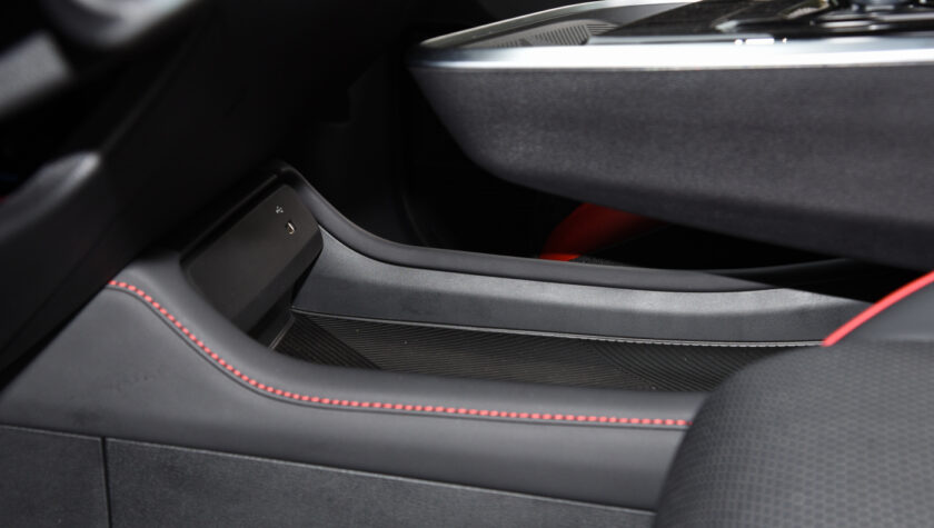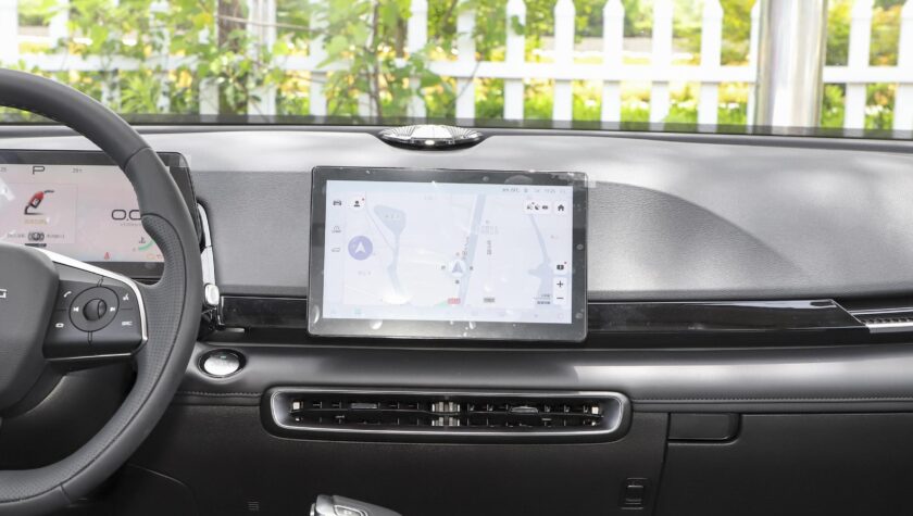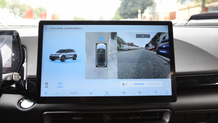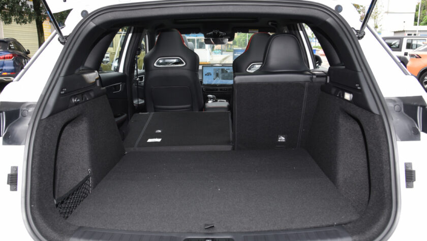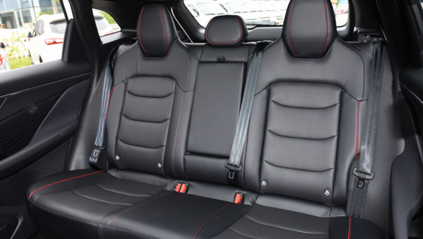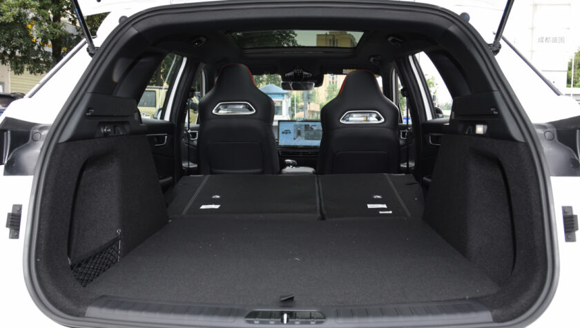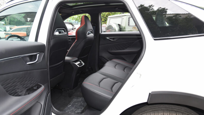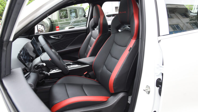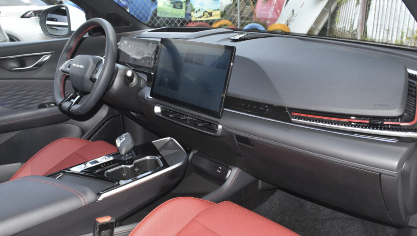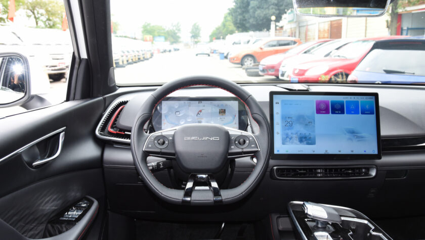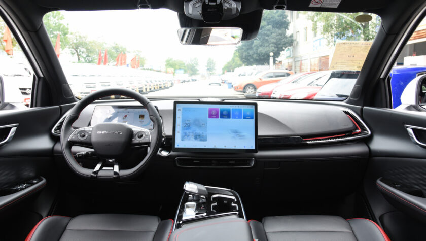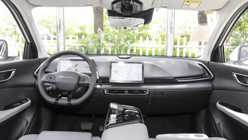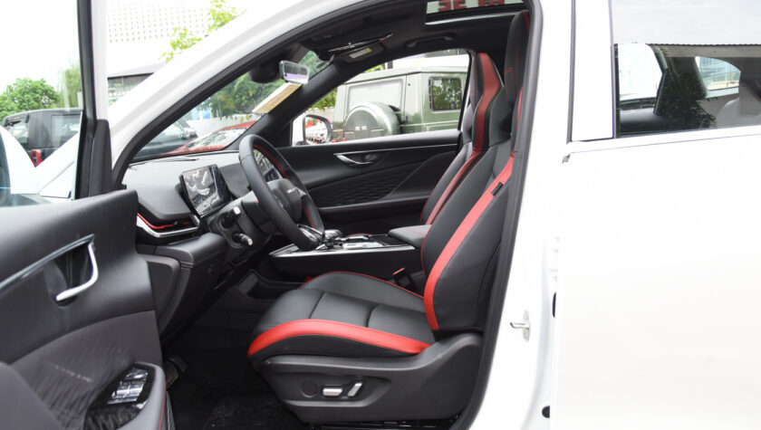 Салон BAIC X55 2024, напротив, выглядит лаконично, но имеет все необходимое: высококонтрастные дисплеи, мультируль и эргономичную двухъярусную надстройку между широкими креслами, сделанными наподобие спортивных со встроенными подголовниками.