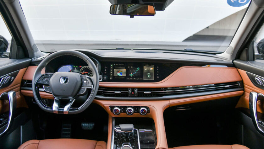 В салоне обновленного Changan CS95 New 2024 изменений практически нет, архитектура и передняя панель остались прежними. Единственное заметное изменение это джойстик переключения АКПП, вместо классического селектора и немного измененный руль. Сам салон – 7-местный (с трехместным диваном на втором ряду).