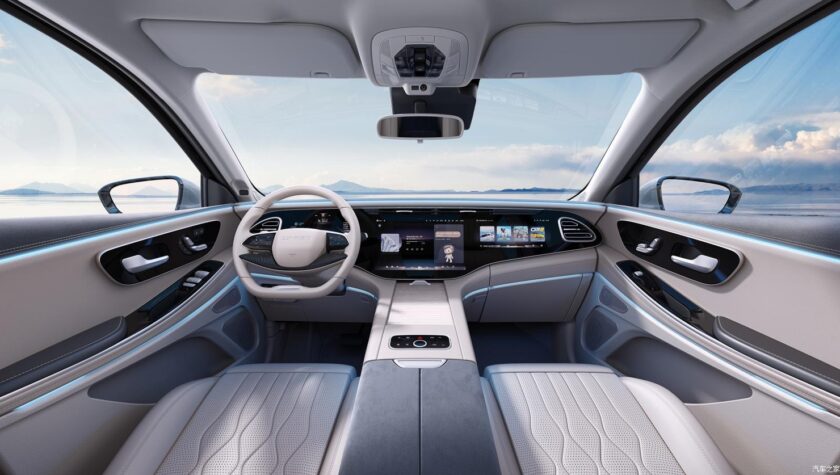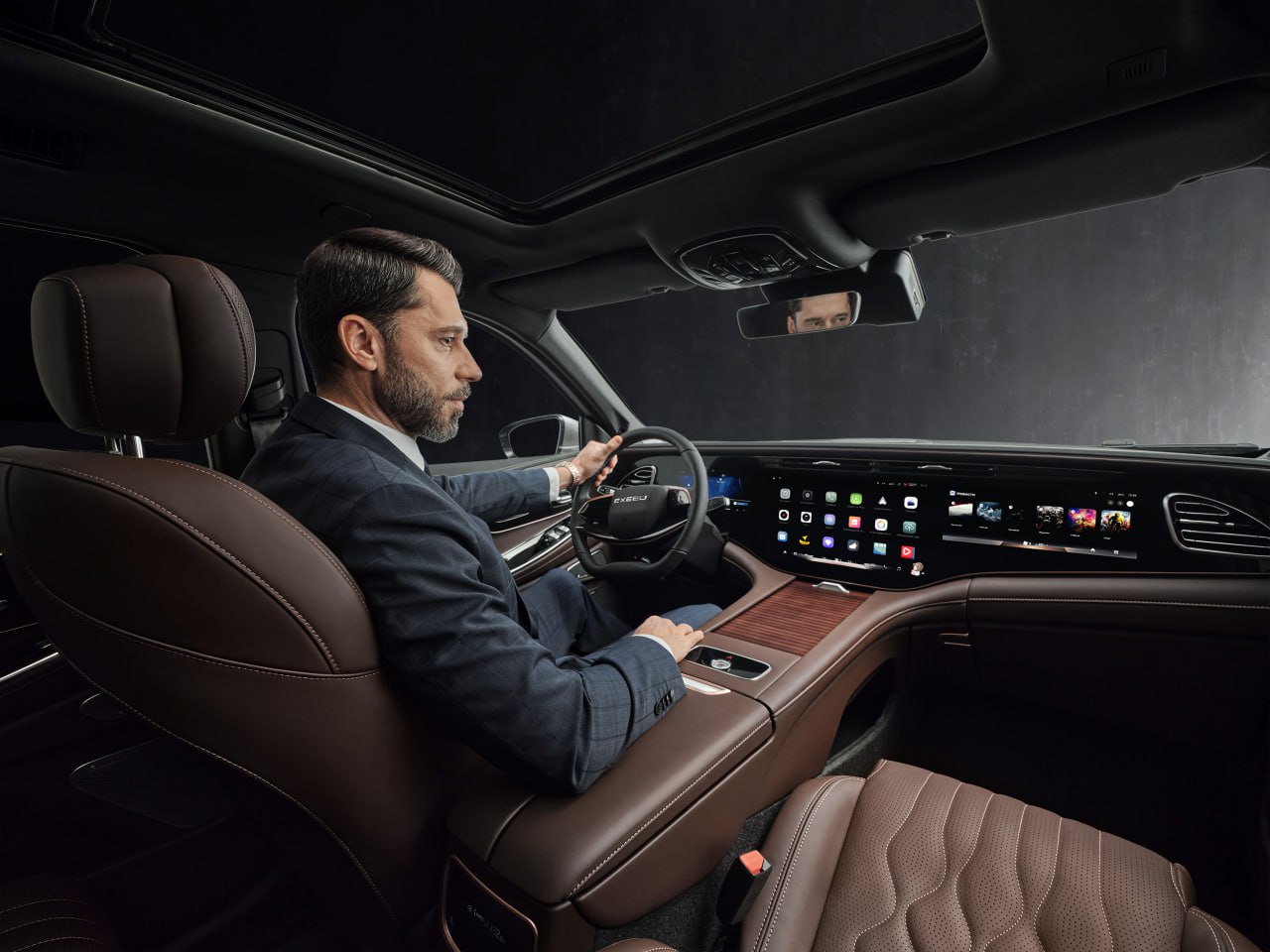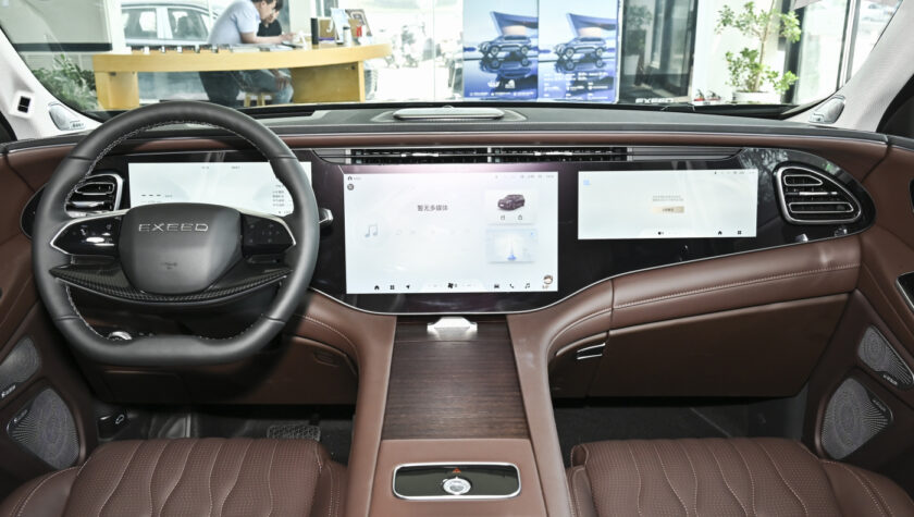 Но самое главное изменение рестайлинга Exeed VX 2024 – это полностью новая передняя панель в салоне: стеклянная поверхность во всю ширину салона, под которой три встроенных дисплея (приборная панель, медиасистема и экран для переднего пассажира). Очевидно, дизайн и архитектура скопированы с современных электромобилей Mercedes-Benz линейки EQ (у немцев она называется Hyperscreen).
