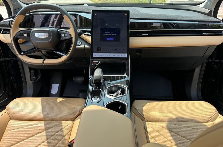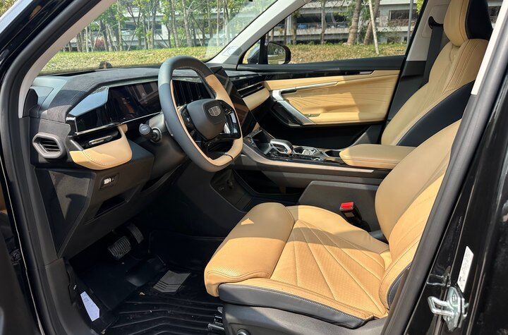 Обивка салона кроссовера Geely Atlas 2024 стандартно идет в виде искусственной кожи. Также в «базе» – 10.25-дюймовая приборная панель и планшет в исполнении сенсорного 13.2-дюймового дисплея, управляемого ОС Geely Galaxy, работающей на чипе Qualcomm Snapdragon 8155.