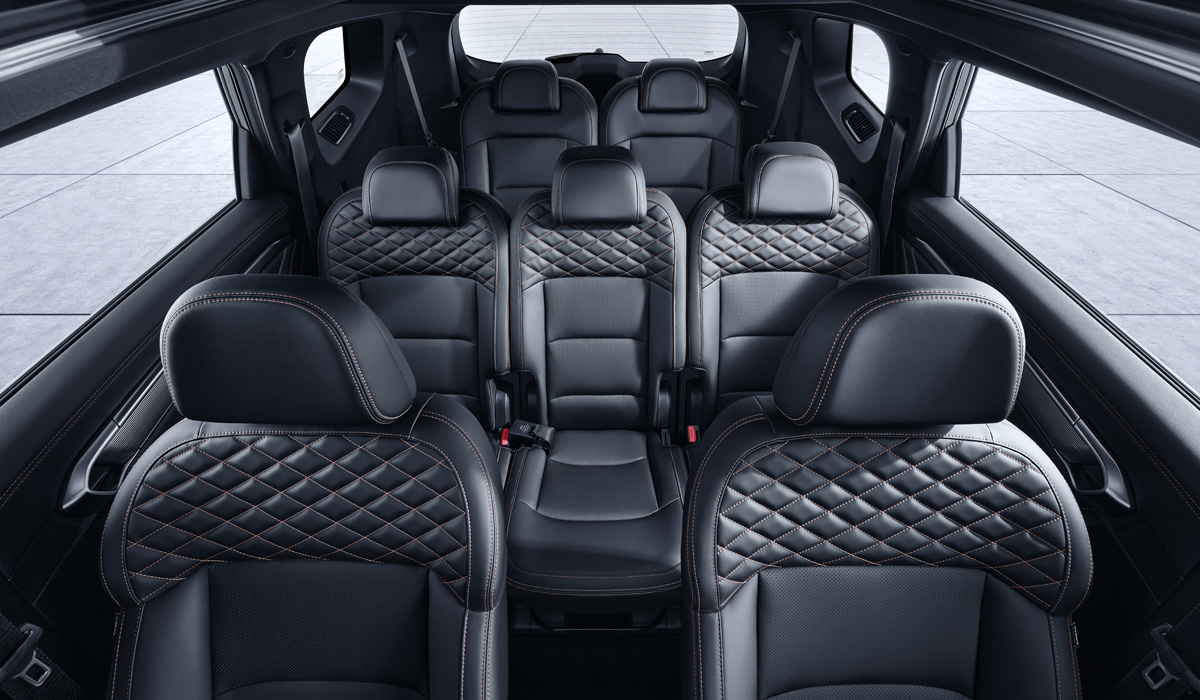 Geely Okavango 2024 имеет трехрядный салон, где на втором установлены три раздельных кресла (у двух боковых есть подогрев), а на галерке могут разместиться два пассажира.
