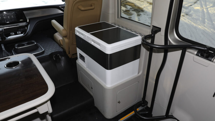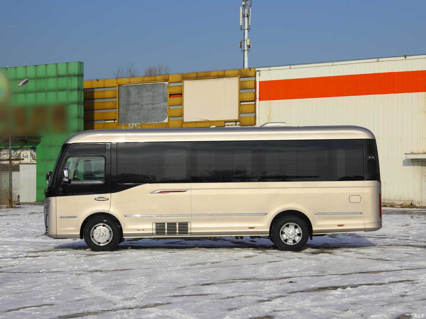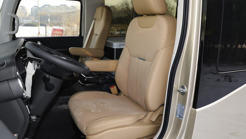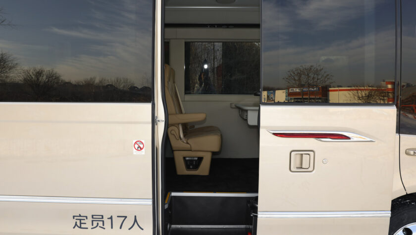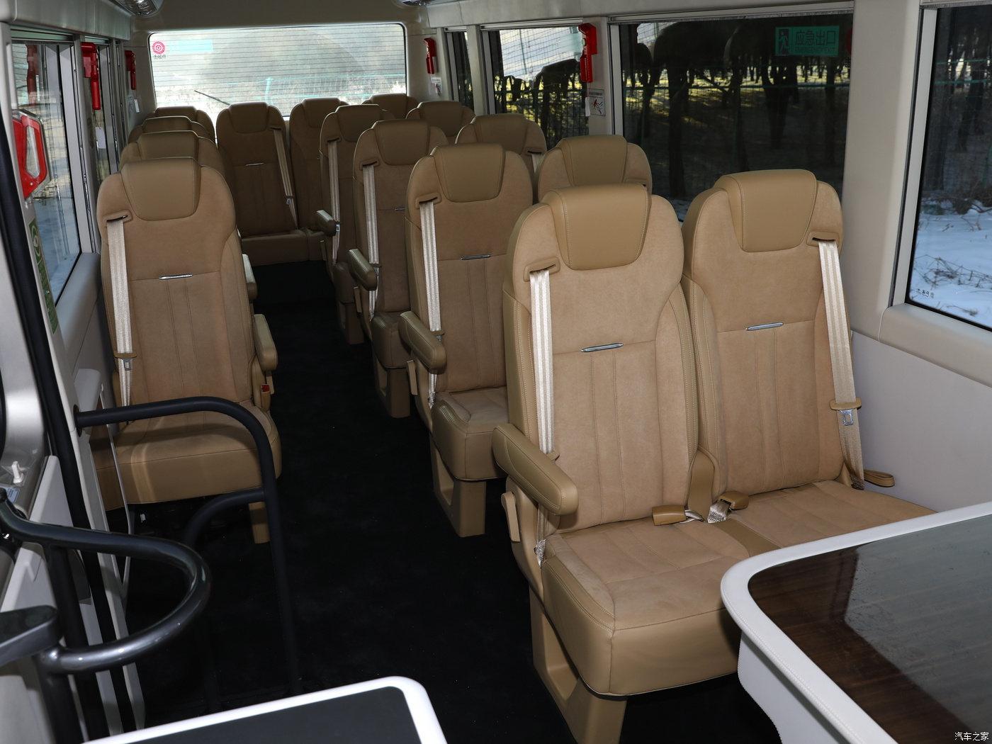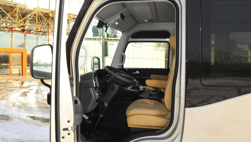 Речь идет об автобусе Guoyue малого класса: в длину он имеет 7295 мм, поэтому в салоне помещается максимум 23 посадочных места, включая водительское. Наиболее дорогой вариант компоновки – 17-местный, где за водителем размещается рабочий стол, под которым прячется холодильник для напитков.