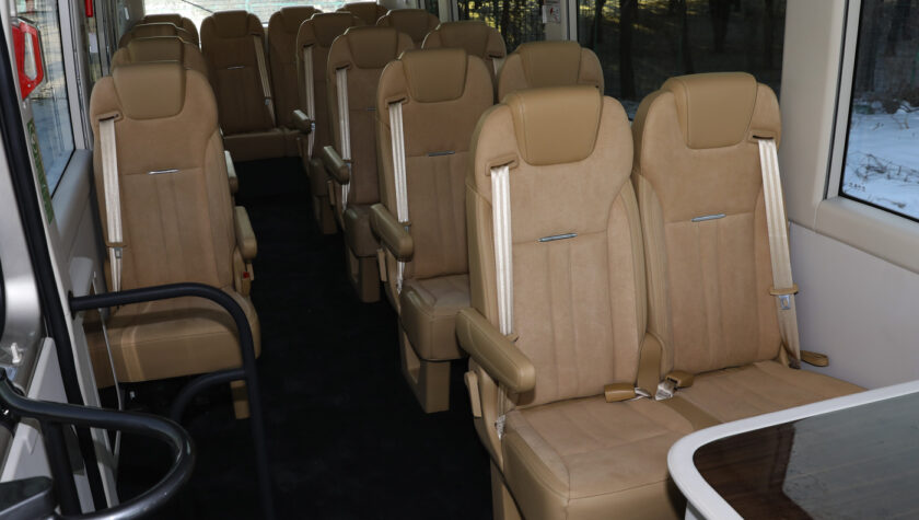 Все находящиеся в автобусе кресла отделаны кожей, имеют подлокотники и откидывающуюся назад регулируемую спинку. Также есть многочисленные воздуховоды, позволяющие быстро менять температуру воздуха в салоне. А при посадке в него к услугам пассажиров предлагается удобная выдвижная подножка. Кроме этого, все стекла в автобусе являются двухслойными, что гарантирует прекрасную шумоизоляцию.