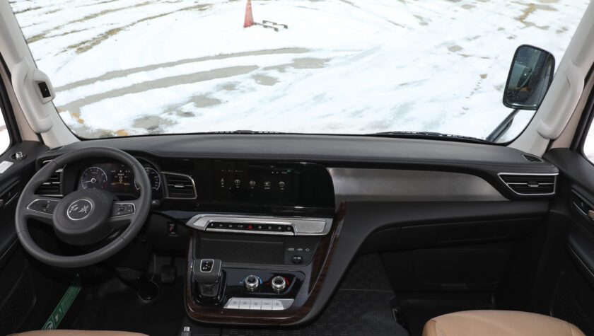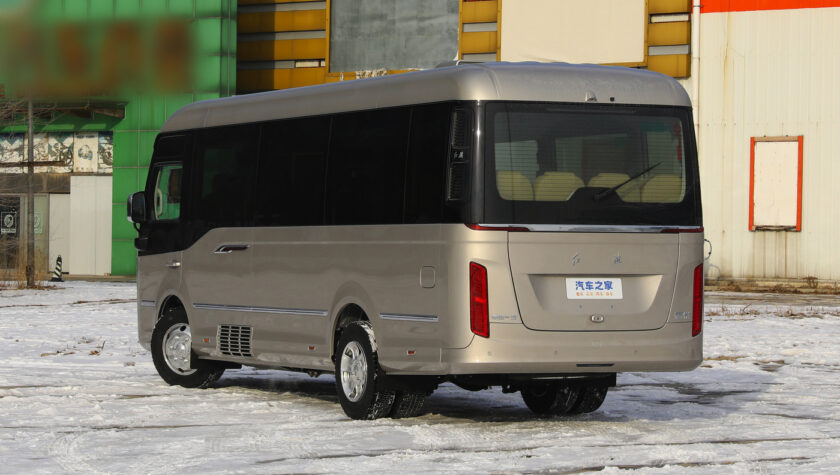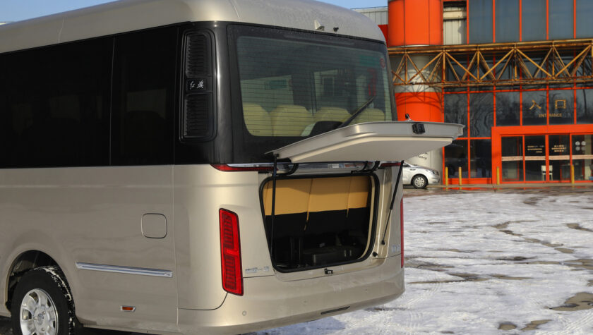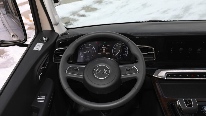 Блоки головной оптики находятся в нижней части бампера, а сзади фонари выполнены в виде вертикальных полосок – тоже светодиодных и прячущихся заподлицо прямо на округлых гранях кузова. Любопытным решением является асимметричное расположение стоек боковых зеркал, но это, прежде всего, удобно водителю, да и автобус Hongqi CA630 из 80-х гг. прошлого века имел точно такие же стойки.