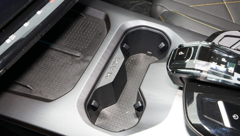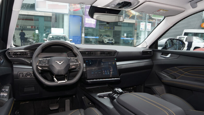 Дизайн и архитектура передней панели кроссовера Kaiyi X7 Kunlun не тривиальны. Дисплей приборки благодаря пластиковому обрамлению имеет не прямоугольную форму и прячется под стильным козырьком. Перед ним – мультируль с обилием кнопок, где можно найти и кнопку запуска двигателя, и клавиши выбора ездовых режимов. По бокам от «приборки» размещаются воздуховоды, а пара центральных дефлекторов располагается аккурат над большим «телевизором» мультимедийки, который имеет по диагонали 14.6 дюйма.