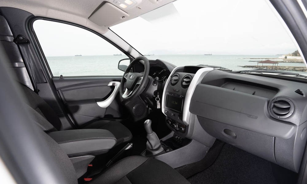 Салон грузового Ларгуса напоминает о Renault Duster первого поколения, так как здесь та же простая аналоговая приборная панель и центральная «башня» с круглыми воздуховодами, панелью настройки «климата» и компактным 7-дюймовым экраном системы мультимедиа. В оснащении авто заявлены: штатный навигатор, трехступенчатый подогрев сидений, круиз-контроль, обогрев наружных зеркал и водительское кресло с механическими регулировками.