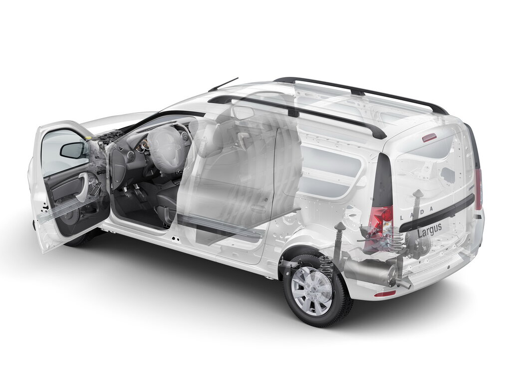 Фургон Lada Largus базируется на переднеприводной «тележке» B0 со стойками McPherson спереди и полузависимой задней подвеской в виде U-образной балки. У авто дисковые передние тормоза и барабанные задние, плюс система ABS+BAS. Под капотом – рядная четверка объемом 1.6 литра, которая может быть в разных исполнениях: