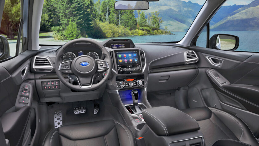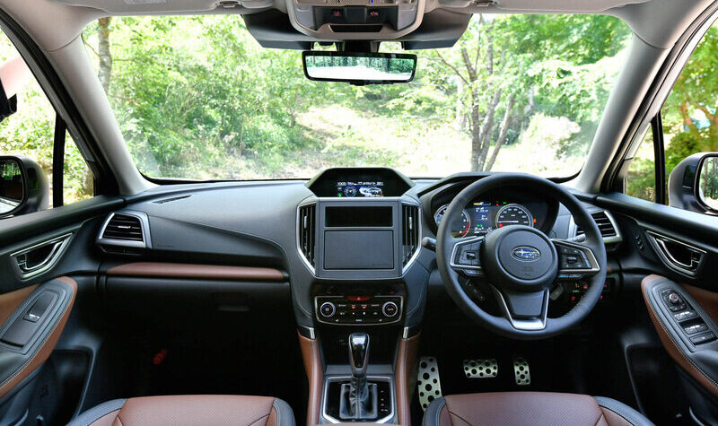 В салоне архитектура передней панели тоже не сильно изменилась, он по прежнему по японски консервативен: перед водителем аналоговая приборная панель, а по центру вертикальный дисплей мультимедийной системы как у новых моделей марки, например, Subaru WRX или Subaru Legacy.